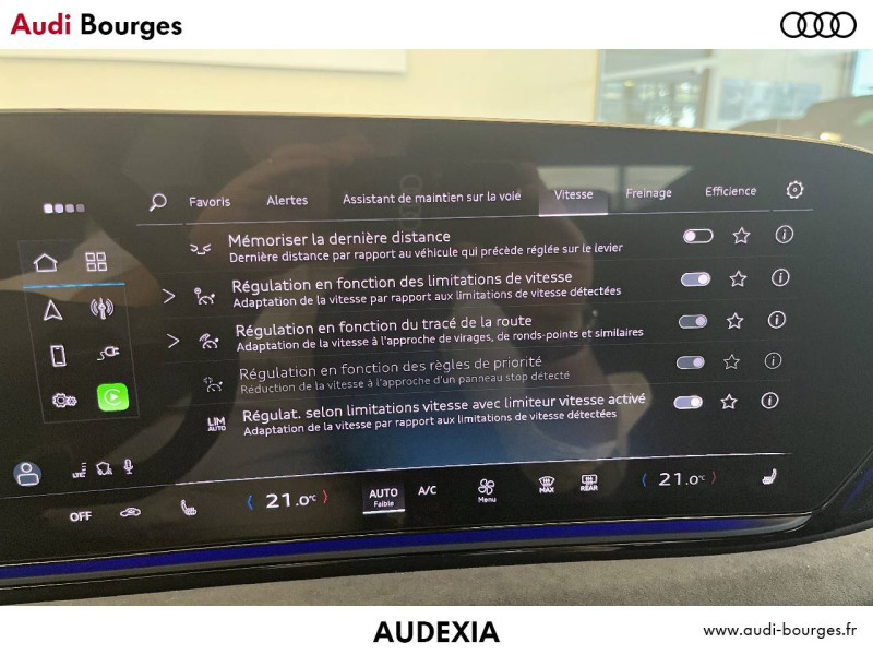 Régulateur de vitesse adaptatif et prédictif ACC avec limiteur de vitesse détecte dans les limites du système et à l'aide d'un capteur radar les véhicules qui précèdent et maintient la distance en intervenant sur les freins et l'accélérateur (régulation active, de 0 à 210 km/h ; jusqu'à l'arrêt du véhicule). Le conducteur peut calibrer la distance souhaitée par rapport aux autres automobilistes