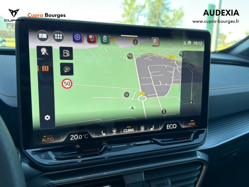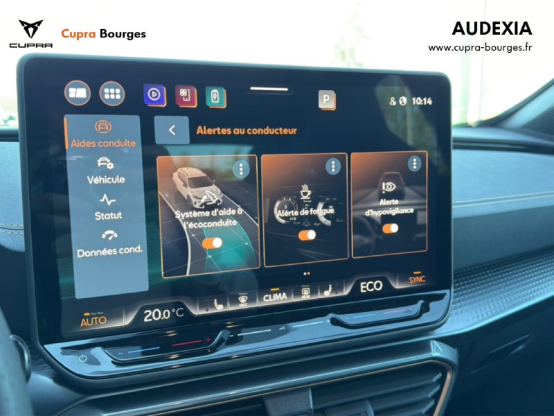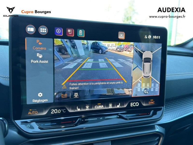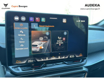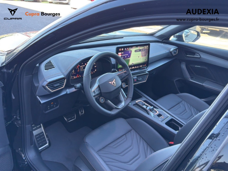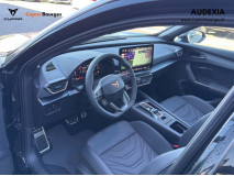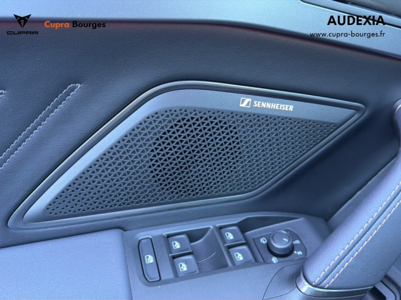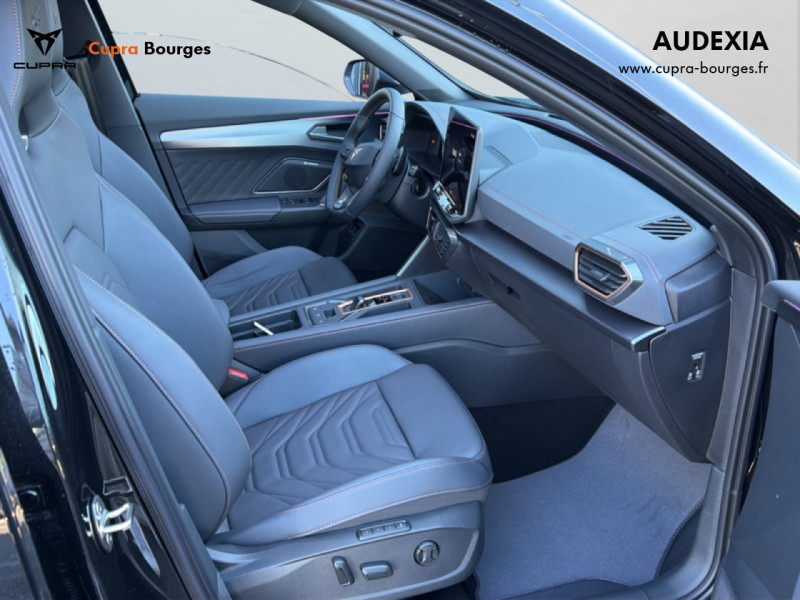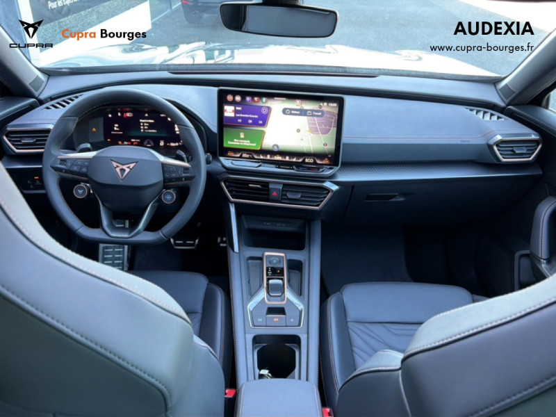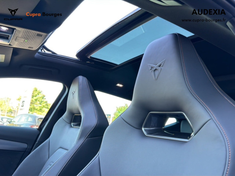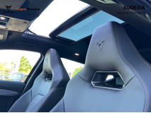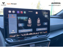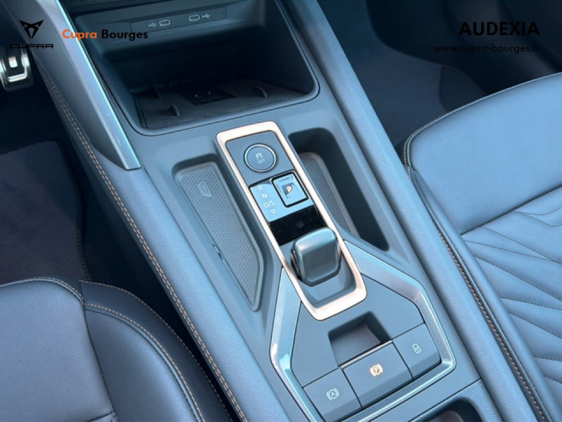 Design intérieur Progressive – Sièges baquets cuir Gris Lunaire avec surpiqûres cuivrées – Logos CUPRA embossés sur les appuie-têtes – Planche de bord Gris Lunaire surpiquée avec inserts Dark Alu – Contre-portes en TEP noir surpiqués – Sièges conducteur et passager chauffants avec réglage électrique à mémoire, y compris réglage lombaire