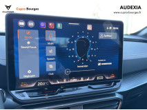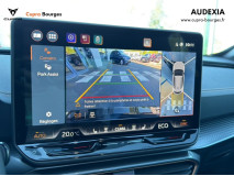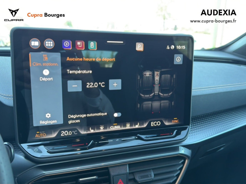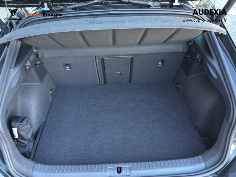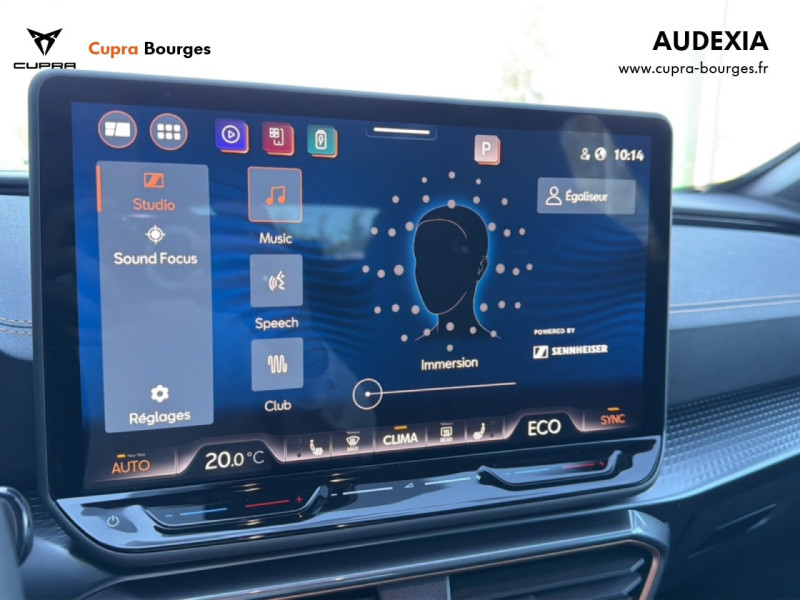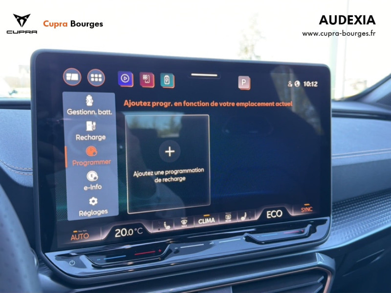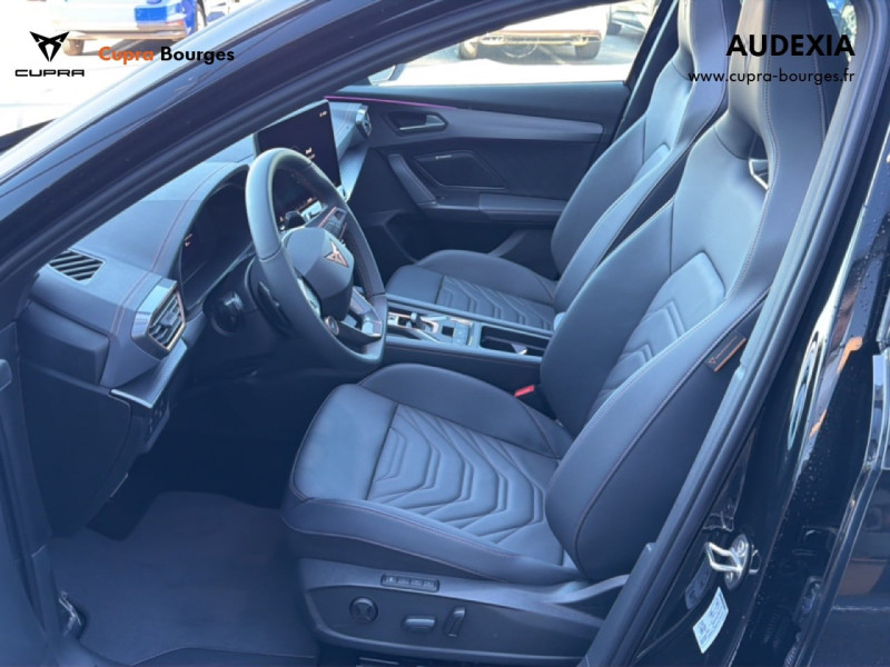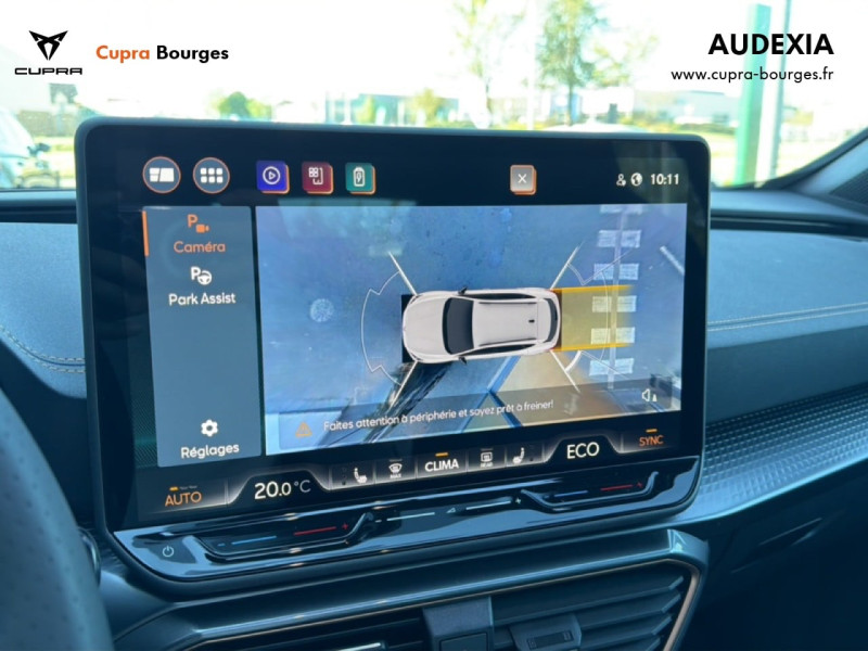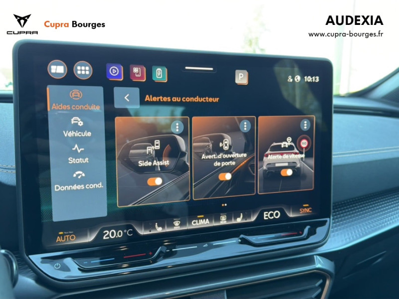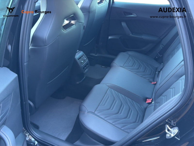 Design intérieur Progressive – Sièges baquets cuir Gris Lunaire avec surpiqûres cuivrées – Logos CUPRA embossés sur les appuie-têtes – Planche de bord Gris Lunaire surpiquée avec inserts Dark Alu – Contre-portes en TEP noir surpiqués – Sièges conducteur et passager chauffants avec réglage électrique à mémoire, y compris réglage lombaire